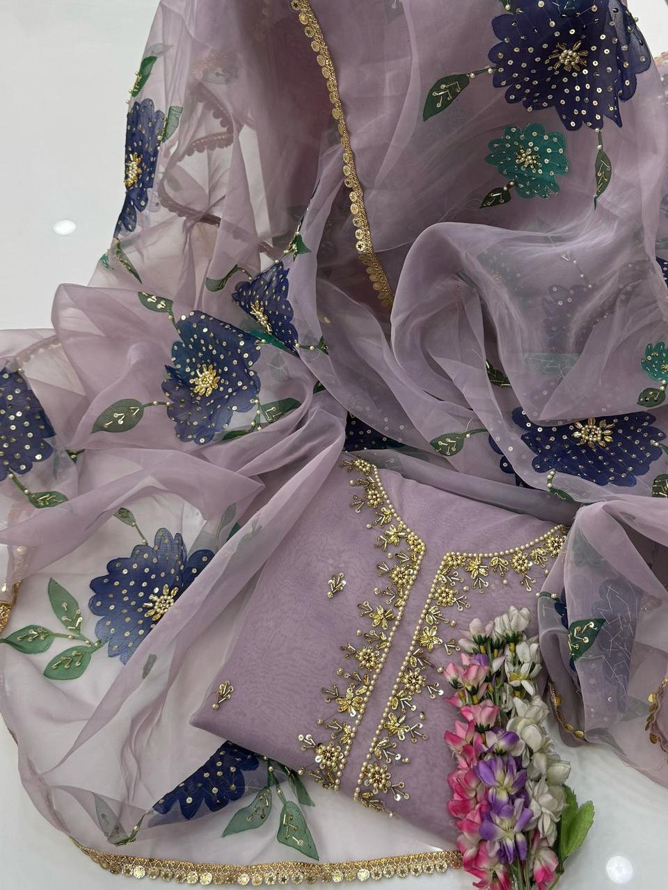 One Of The Beautiful & Stunning Handwork Stones And Beads Work Organza Shirt With Handwork Zaari Beads Work Oil Paint Organza Duppata 2 Pc Dress 👗